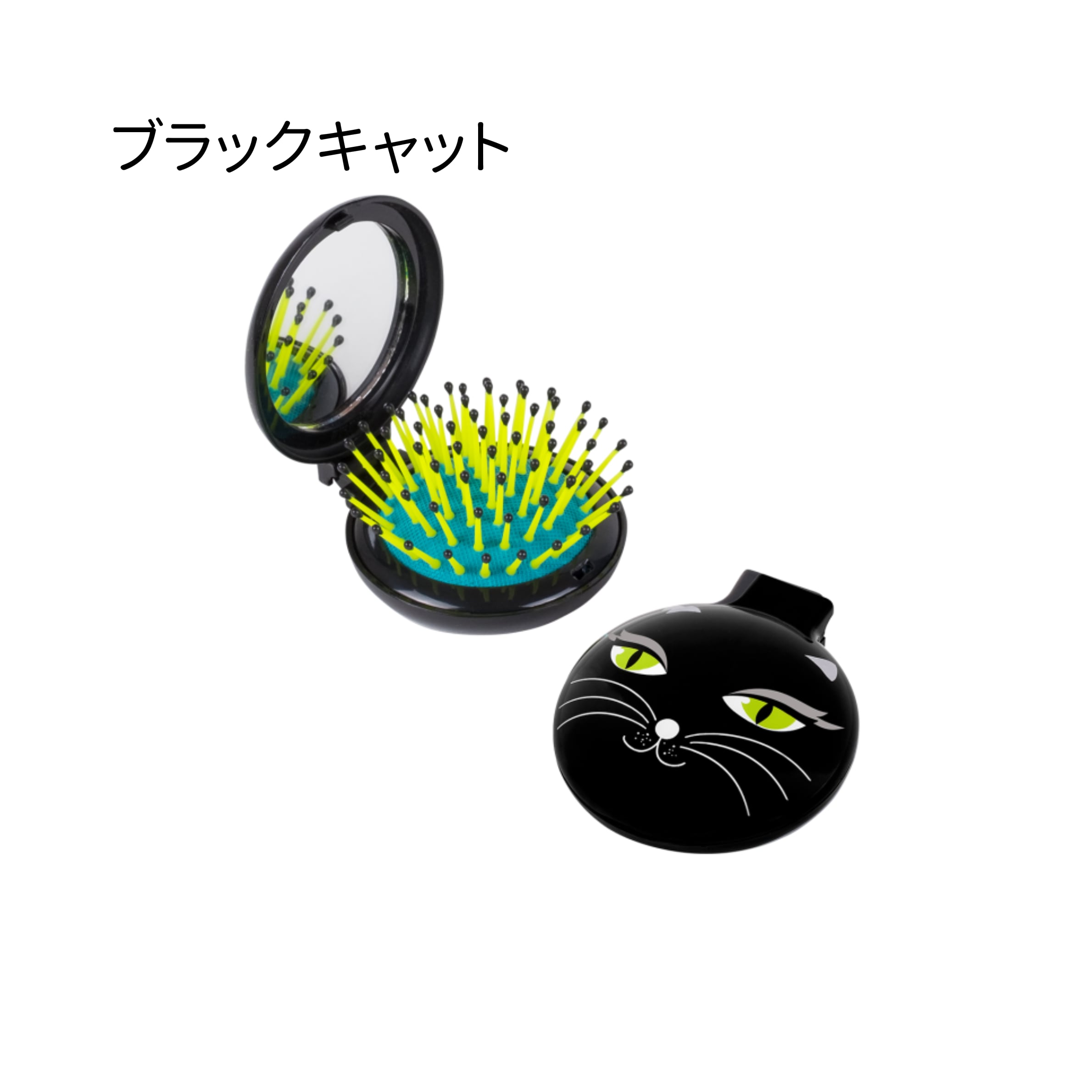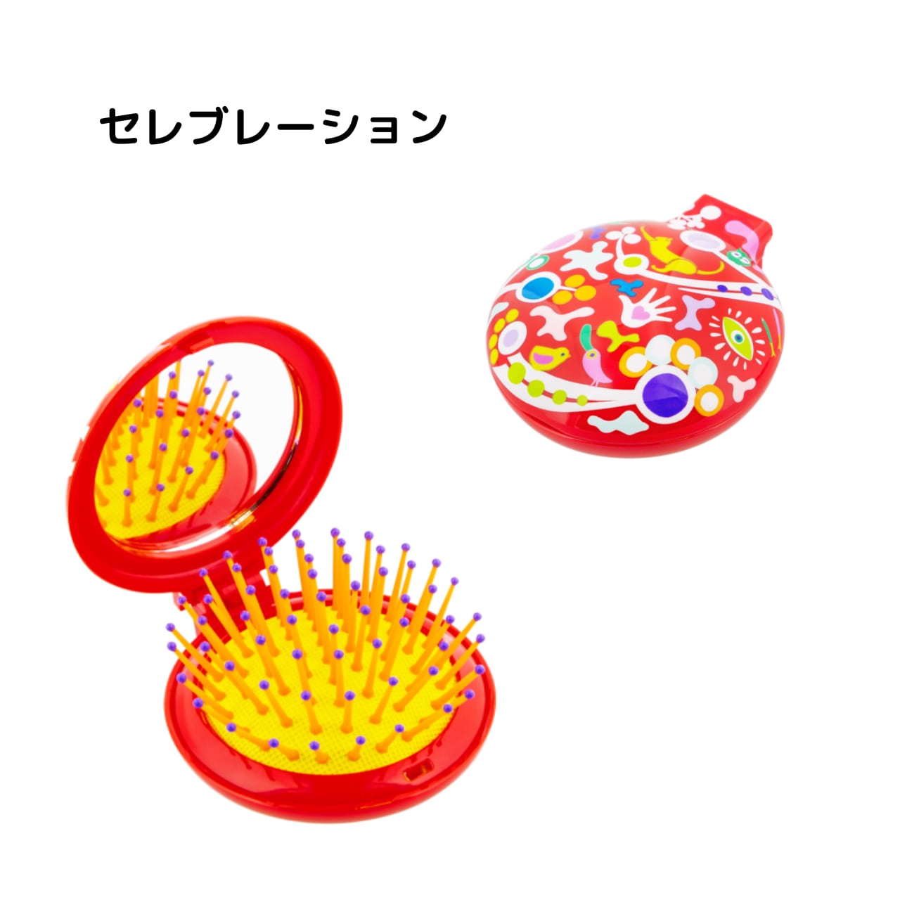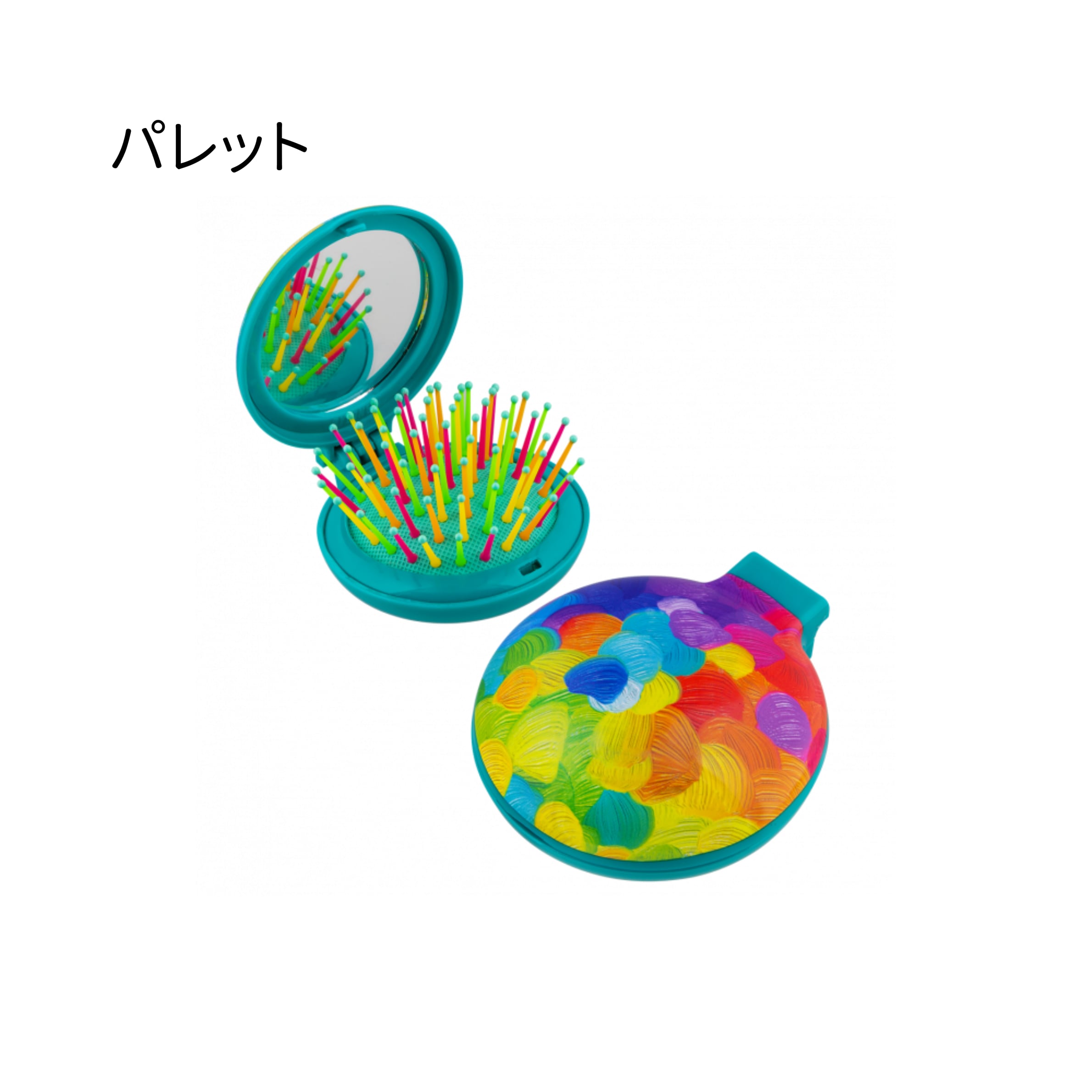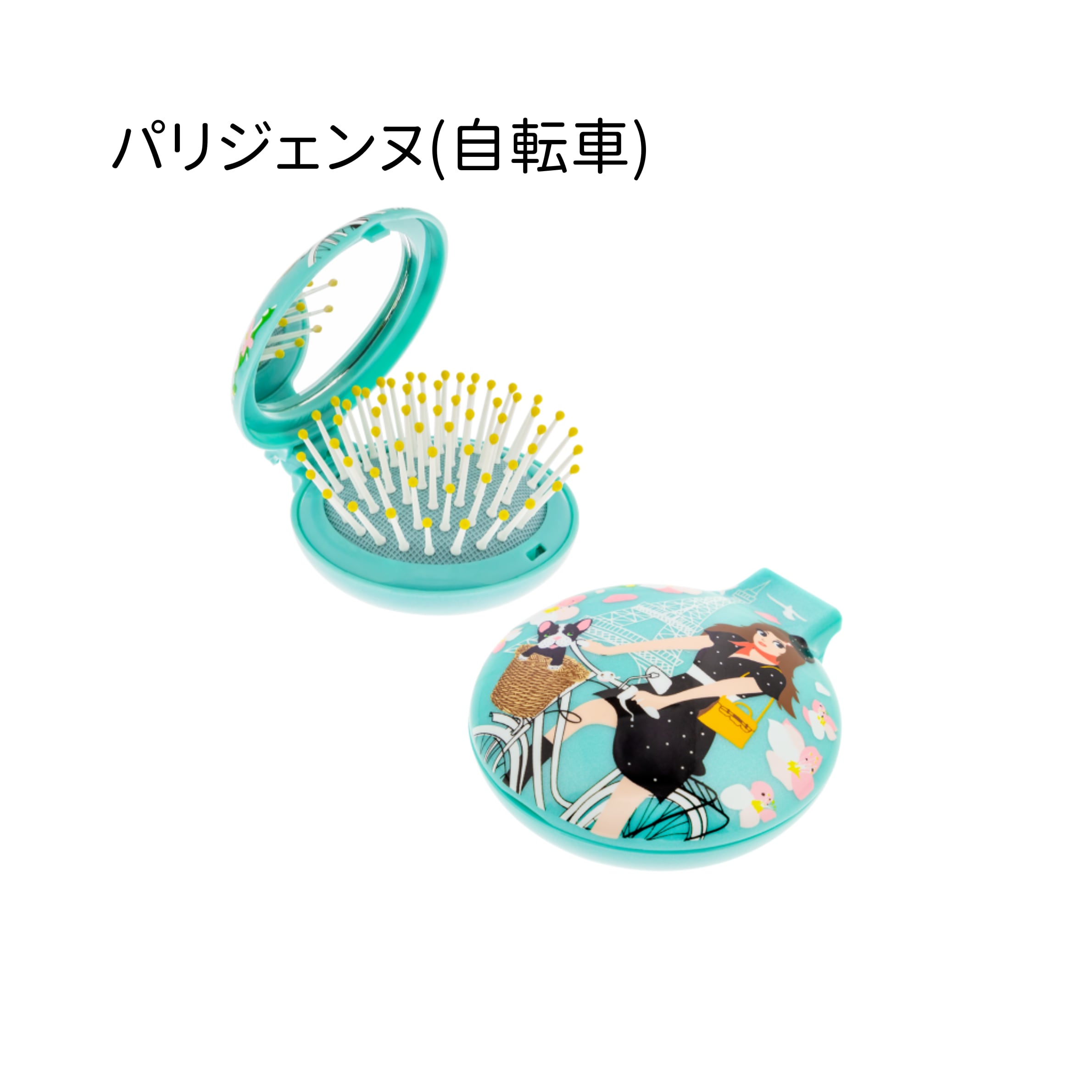 手のひらサイズの可愛いコンパクトで、開くとミラーとヘアブラシが付いています。