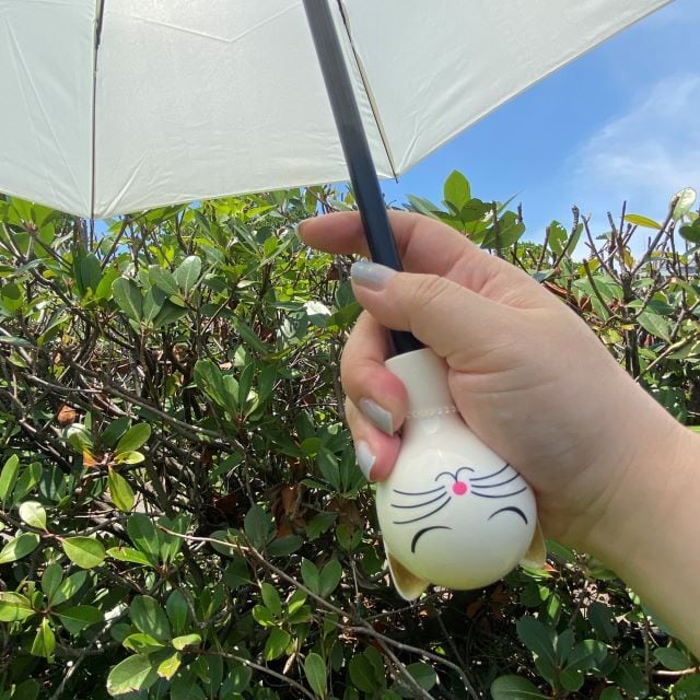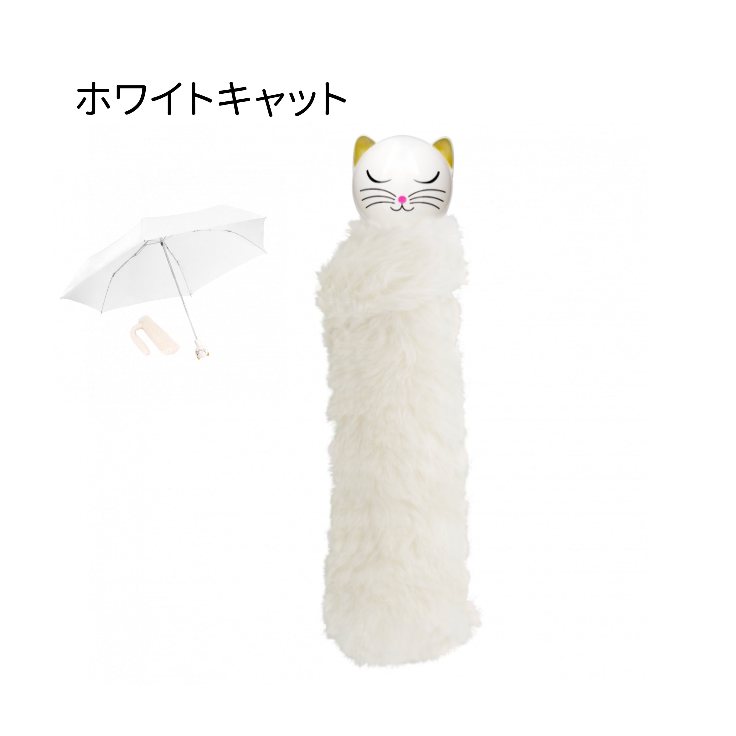 ネコ好きさんにおすすめ!ネコの折りたたみ傘です。なんと言っても特筆すべきは、尻尾が生えたファー素材のポーチ。今までのカサの常識を覆す斬新な発想です。ポーチの内部はナイロン製なので、多少濡れたくらいなら大丈夫。それよりも、そのデザイン性に脱帽です。カサの先端には、ネコのアイラインと同色の肉球が付いていたりと、ネコ好きの心をくすぐる小粋なディテールが満載!カサを開くと、シンプルな無地なので、男女問わずどなたでもお使いいただけます。